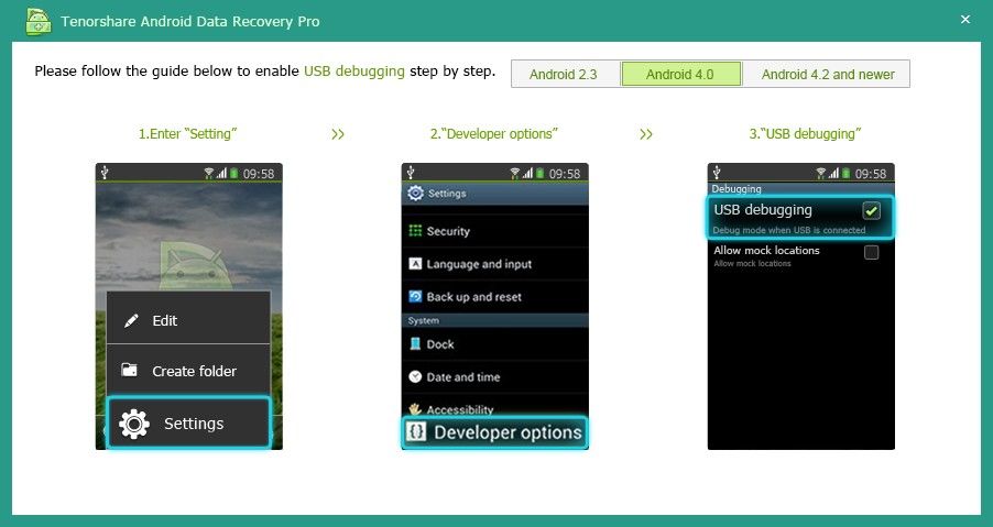 For Android 4.2 or newer, enter “Settings” > “About device”, and tap “Build number” for 7 times until you get the note “You are under developer mode”. Then go back to “Settings” > “Developer options”, and check “USB debugging”.