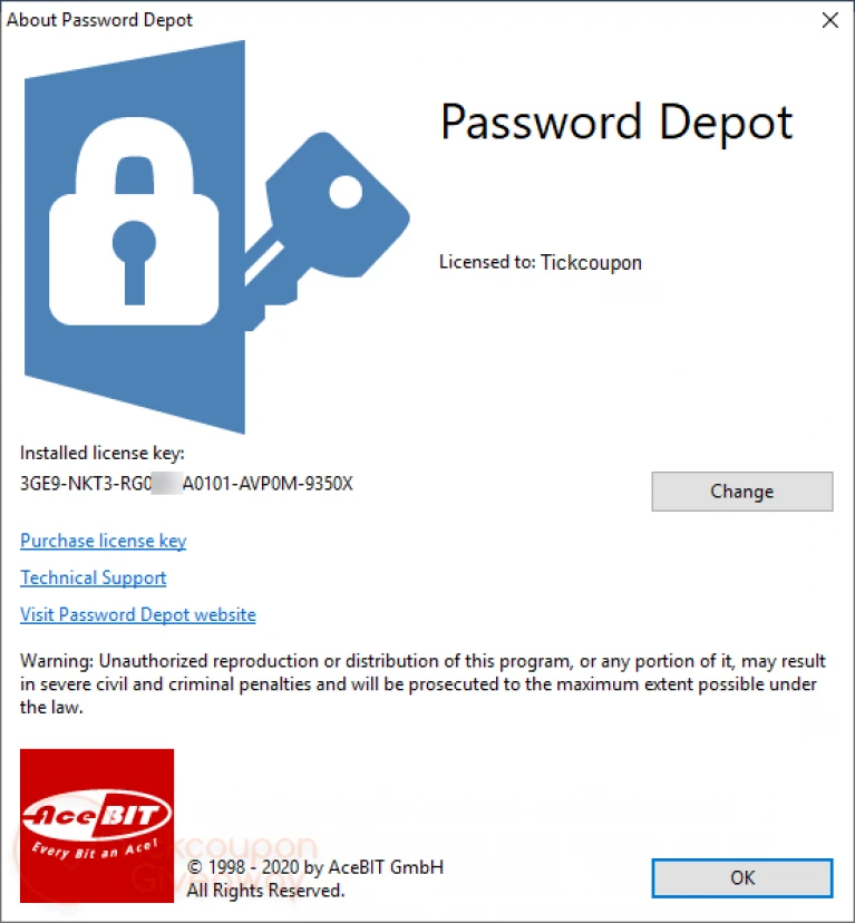 Launch it. On the main window software, click on Help/ About/ Unlock. Register it by using the AceBIT Password Depot license code: